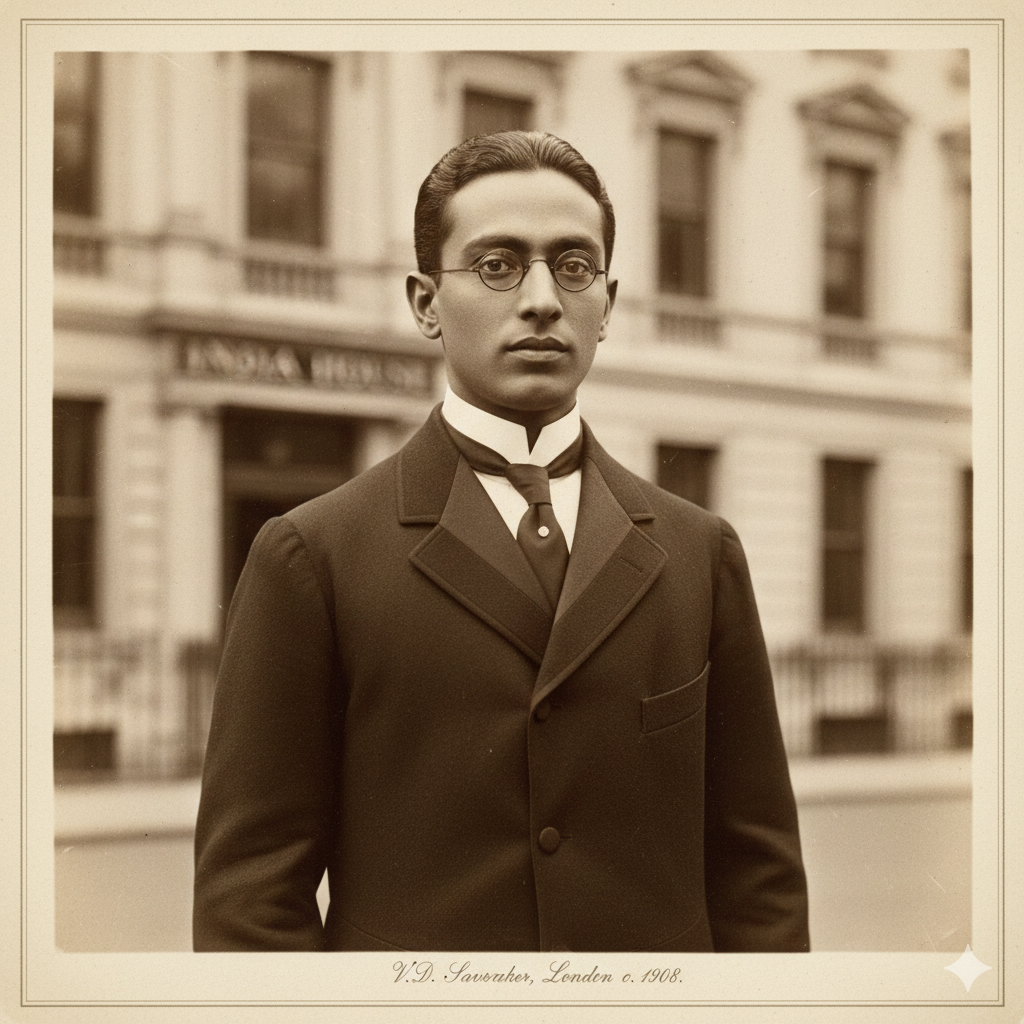 A restored photograph from the revolutionary phase where Savarkar mentored Indian students and led intellectual resistance efforts.