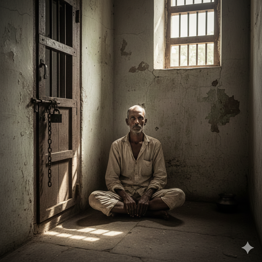 A powerful archival image enhanced from severely damaged originals, capturing the harsh reality of his imprisonment.
